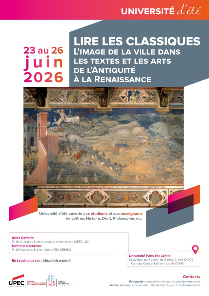 L’Université d’été « Lire les classiques » se déroulera du 23 au 26 juin à l’Université Paris-Est Créteil. Elle comporte trois journées de présentation et de lectures de textes grecs et latins sur le thème de la ville et une journée consacrée à l’Antiquité au cinéma. Elle se terminera par une projection gratuite aux cinémas du Palais.